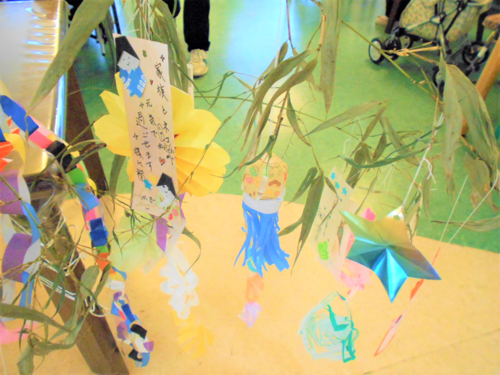 朋央では、七夕のレクリエーションとして皆様と笹を飾りつけました。